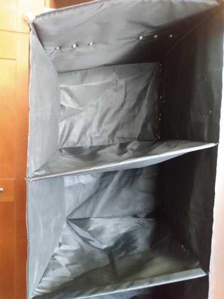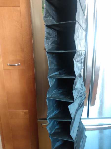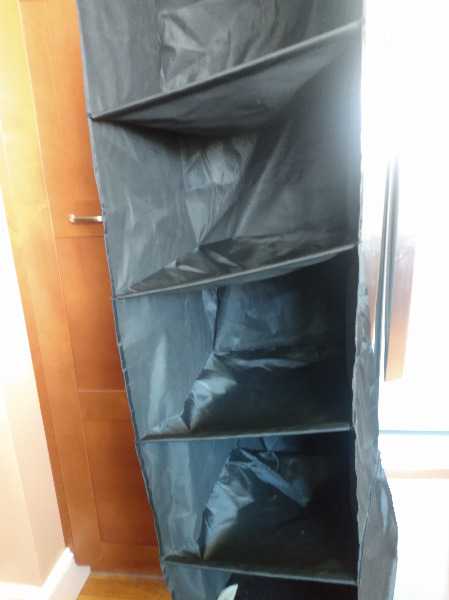 one for shoes (10 slots)/one is larger (5 slots). black. barely used. velcro at top for hanging on rod.