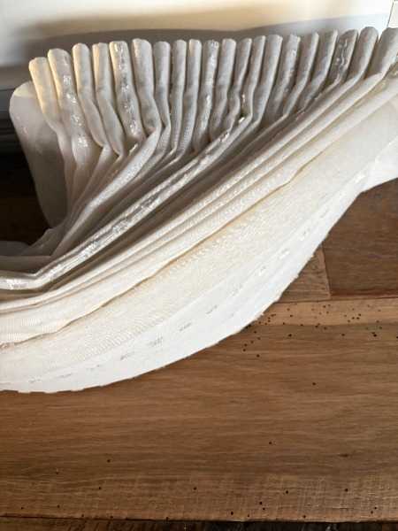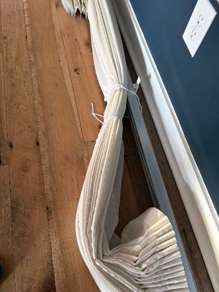 These 138” L x 84” H center split (split stack) vertical blinds are in excellent condition. All slats are intact and undamaged, and all mechanisms function as expected. However, the slats are covered with a fabric that has some minor water stains on the bottom. Since we haven’t attempted to clean them yet, it’s possible that they could be cleaned. These blinds were originally purchased as custom-made from Lowes.