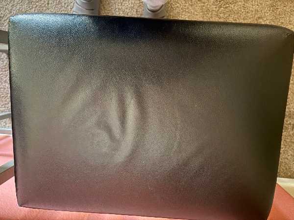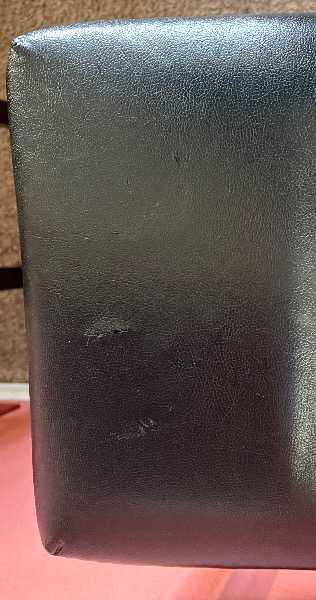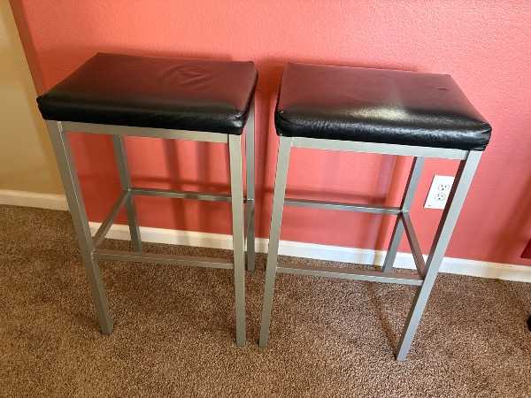 2 metal stools with faux black leather seats.  From non-smoking home.  One seat has a slight tear, about an inch.