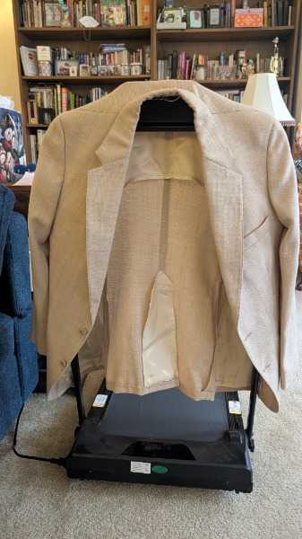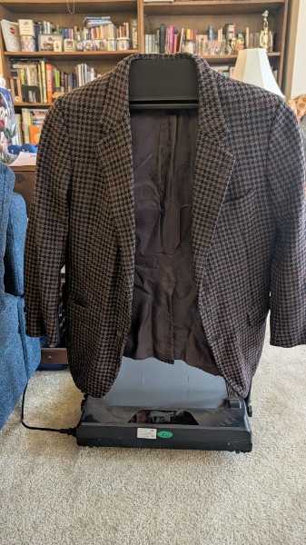One beige (maybe a medium), one brown hounds tooth (maybe a large) Brown on has a quarter size hole around one of the pockets.
