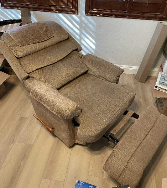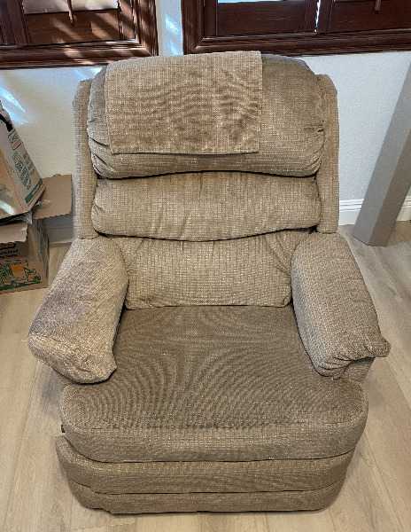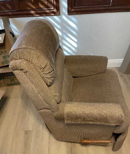 I'm parting with a recliner that swivels and rocks. The mechanism is in great shape, and the cushions are wonderful. Upright it is 39" high, 33" wide, and 32" deep. Fully reclined it is 63" deep. (It reclines until almost flat — more than the picture.) The fabric has a little wear, and I only have one arm rest cover.