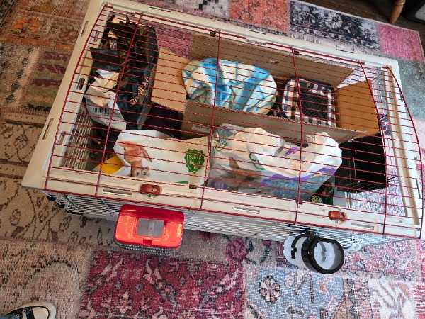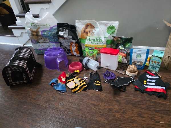 A large guinea pig cage with hay holder, food dish, 2 water bottles, igloo house, bedding, food, hay, treats, travel carrier, nail clippers, Halloween costumes, and outdoor blanket.