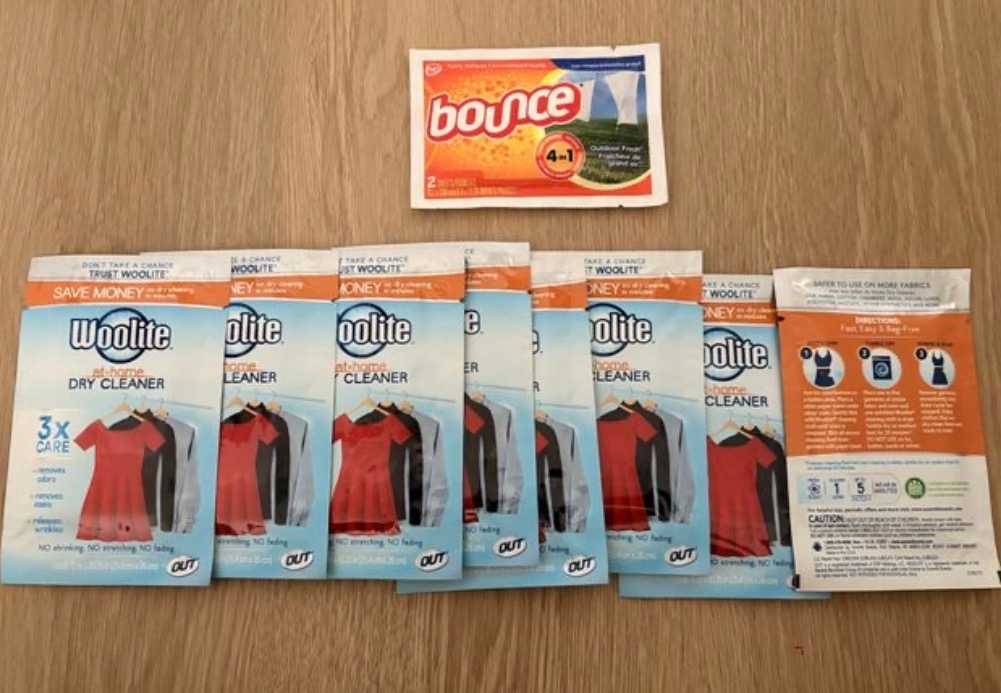8 new packages of Woolite clothing dry cleaner plus 1 travel package of Bounce