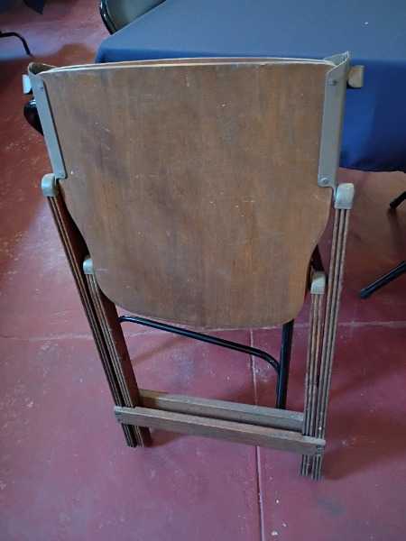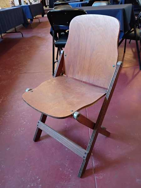 This is an American Seating Company wooden folding chair, institutional grade, commonly supplied to: