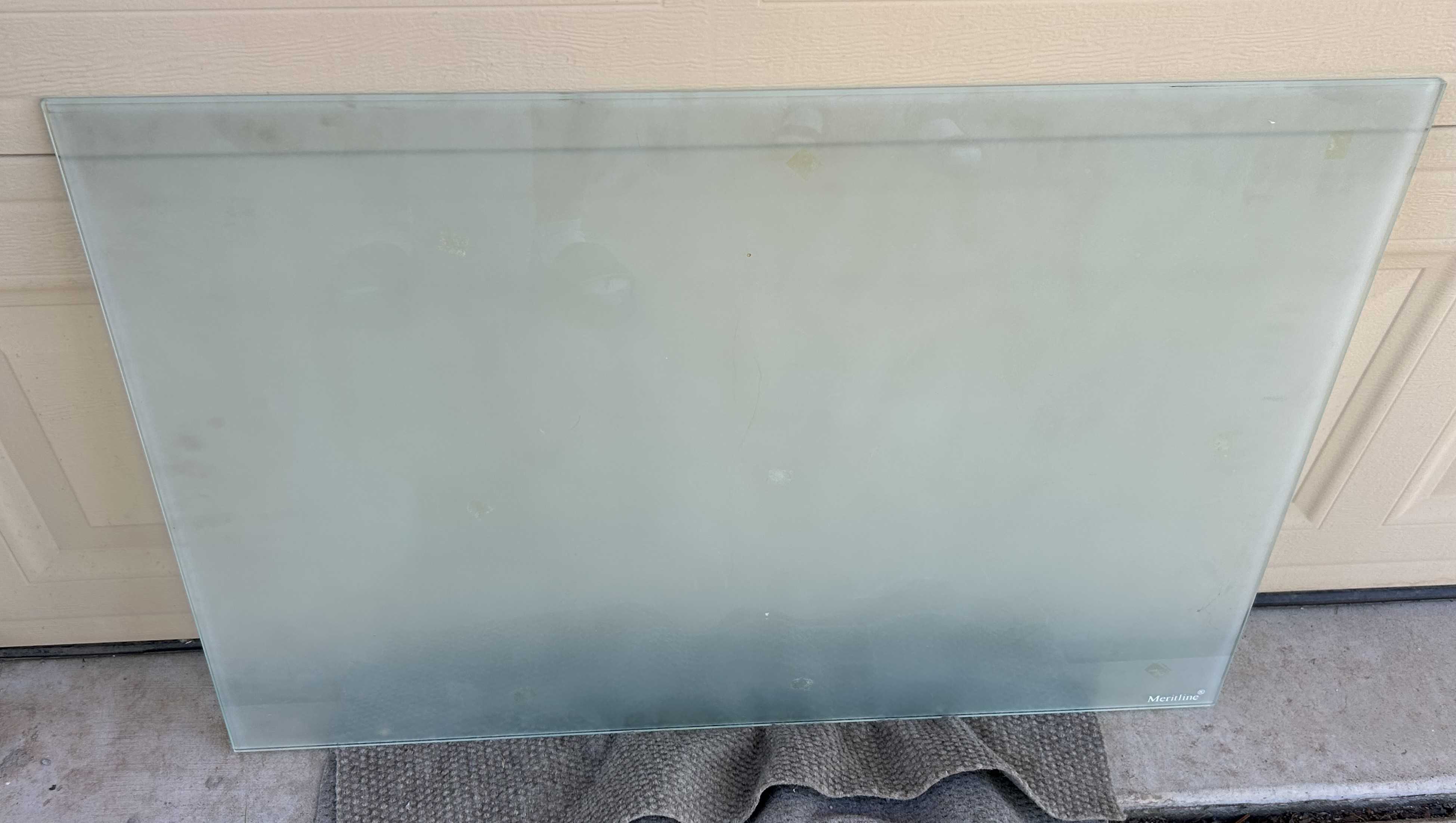 Frosted glass 1/4" thick with polished (smoothed) edges.  Size 23.5" x 34". Labels in one corner of glass - see photo.