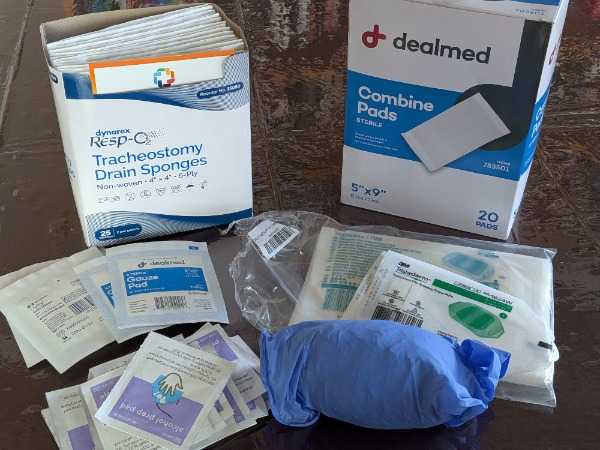 Supplies left over from my appendectomy. Combine pads, drain sponges, Tegaderm, gloves, alcohol prep pads, and a few small gauze pads. Everything is individually wrapped and sterile.