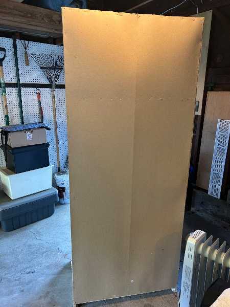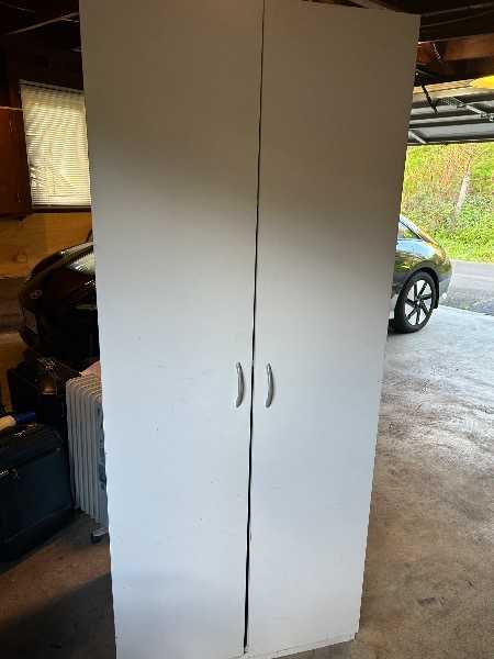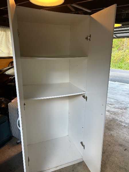 Large white wooden garage storage cabinet.. Measures 30"W x 71"H x 21"D in good condition (but is heavy).