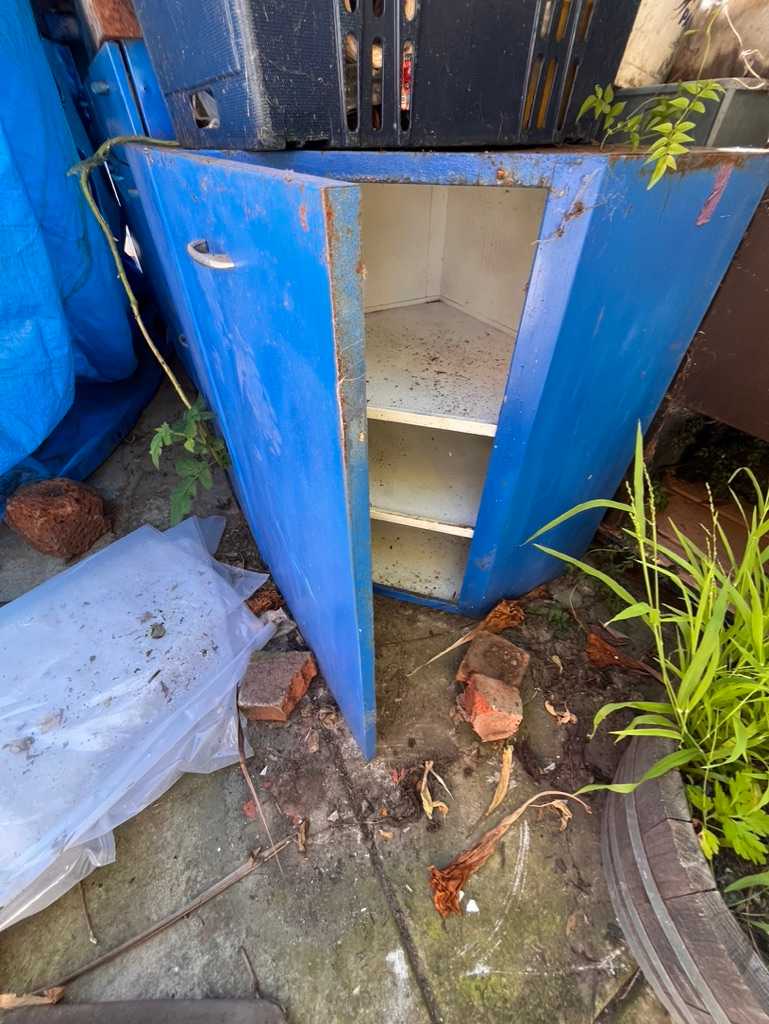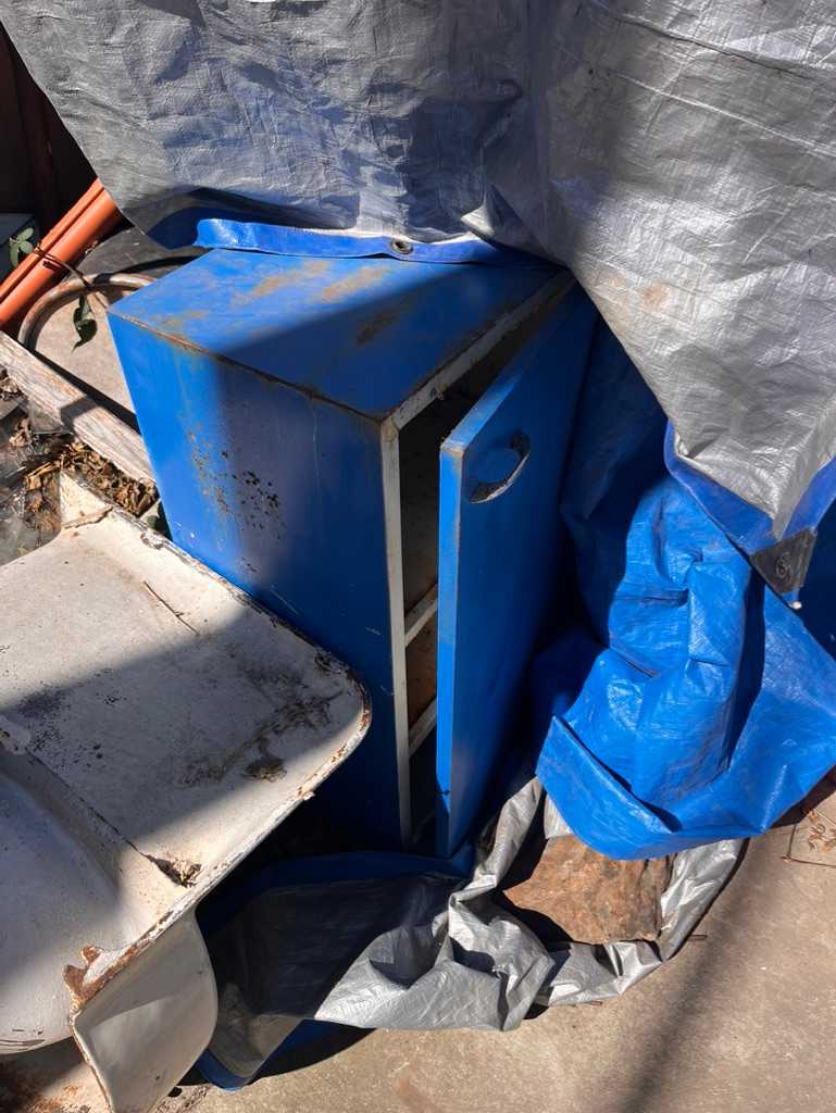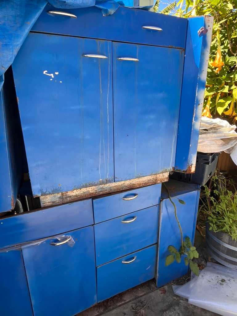 Steel cabinets of all shapes and sizes. Stored outdoors with some light rust.