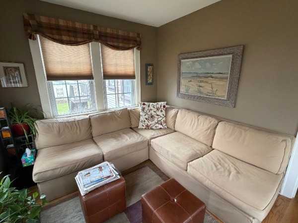 Tan, L-shaped, 8'3" x 8'3" sectional, purchased from Pottery Barn in 2009, in good condition.