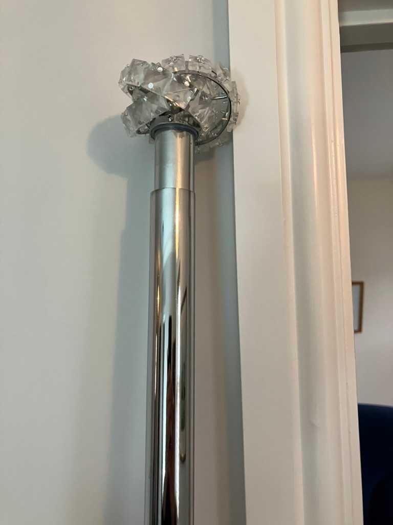 Chrome curtain pole with fittings and decorative finials. 6ft long but can expand to 12ft