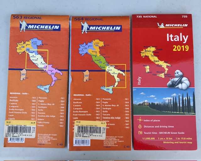 1 national and 2 regional road maps of Italy.  Outdated?  We had such fun using these maps to help us navigate roads and small towns and villages in Italy.  Google and wifi aren't always available, nor as truly informative.