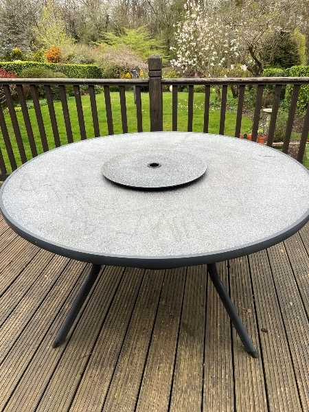 6 seater round table ( 130cm diameter ) with central lazy susan. Dark grey with  stone finish glass top. Some marks on table top from jet wash cleaning. Legs will detach
