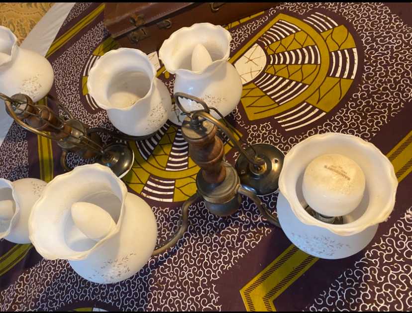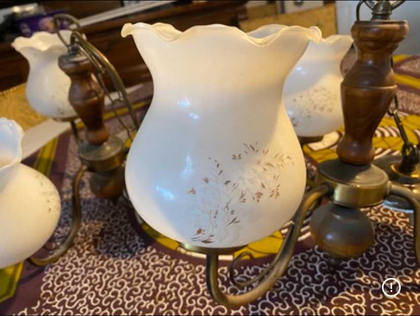 Two ceiling lamps with 3 lights per lamp. Floral design. Wooden main parts. 5 Glass lamp shades - 1 broken and missing.