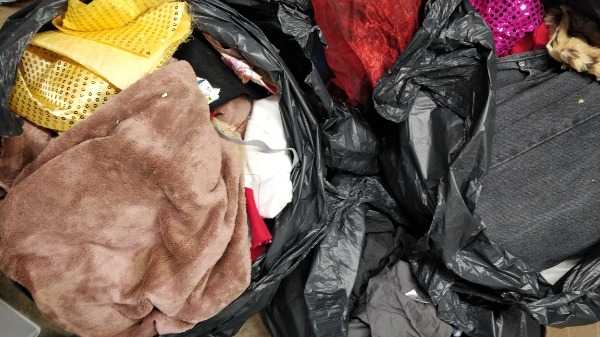 4 bin bags of fabric including old t-shirts, old/worn/ripped jeans, furry fabric, gold sequin fabric and lots more.
