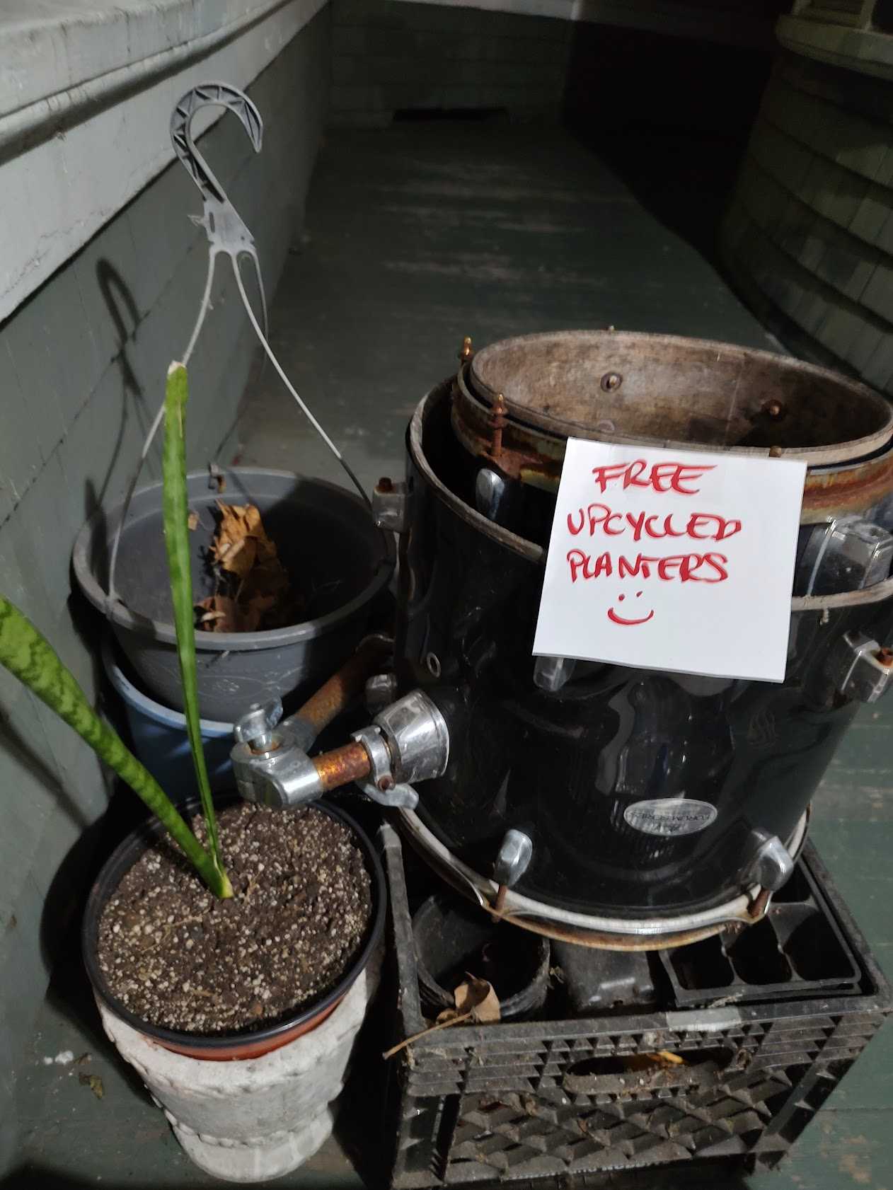 A collection of items for the plant lover, including a sturdy live snake plant in a concrete outdoor pot, a crate of seedling cups for getting your fall seeds ready, a plastic hanging plant basket, and two drums I put plants in as up cycled front porch plant containers - I got compliments for years! On the front porch of a Green-Grey house with hedges and white trim on Laurel Avenue, near Grove Street. Free to First Person to Pick Up!