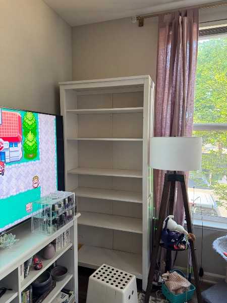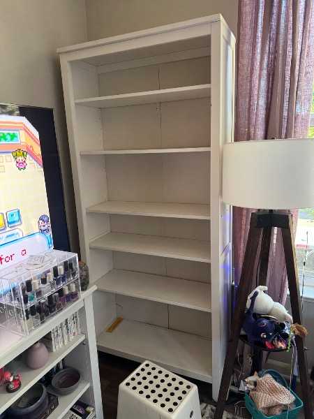 https://www.ikea.com/us/en/p/hemnes-bookcase-white-stain-90371765/ For dimensions and information. A Hemnes bookshelf for free. You must be able to drive off with the bookshelf - I can assist with loading and help breaking it down if you need it. There is a crack in the lower backing board but otherwise seems good.