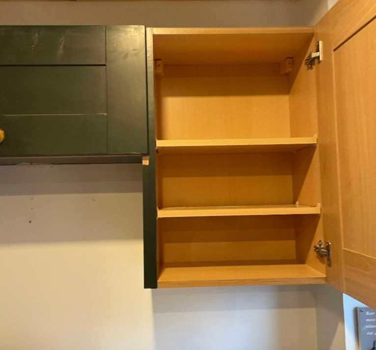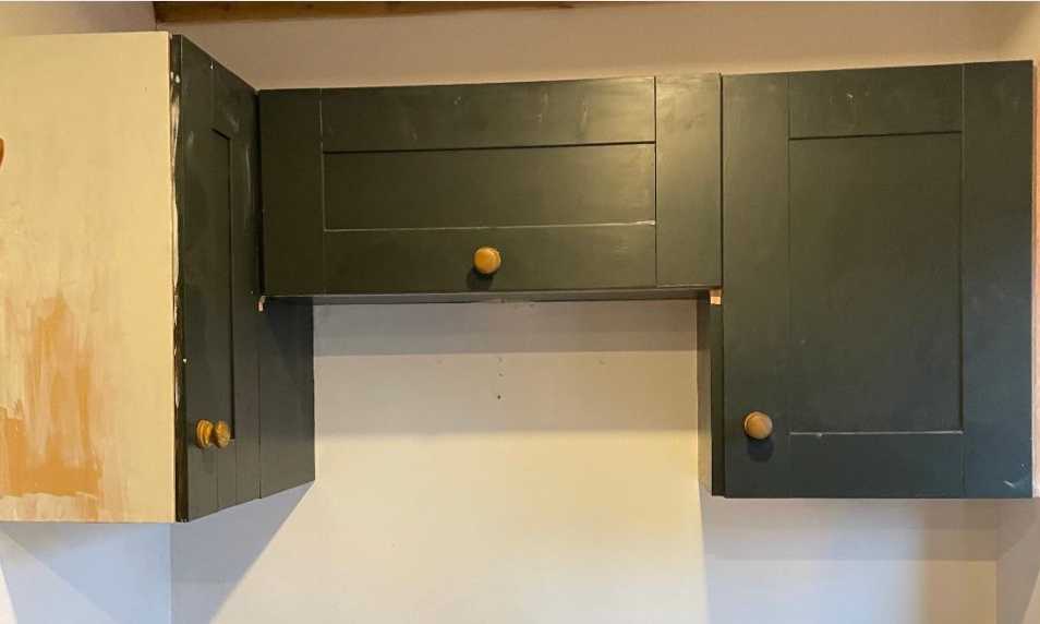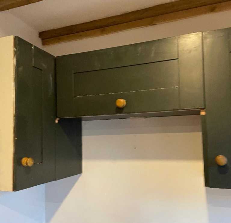 3 kitchen cabinets painted dark green with wooden handles. All dismantled and ready to collect.
