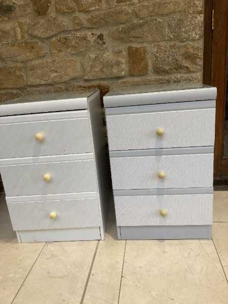 Pair of bedside cabinets with drawers and glass top.  Approx 18 inch square, approx 28 inches tall. As pictured.