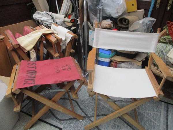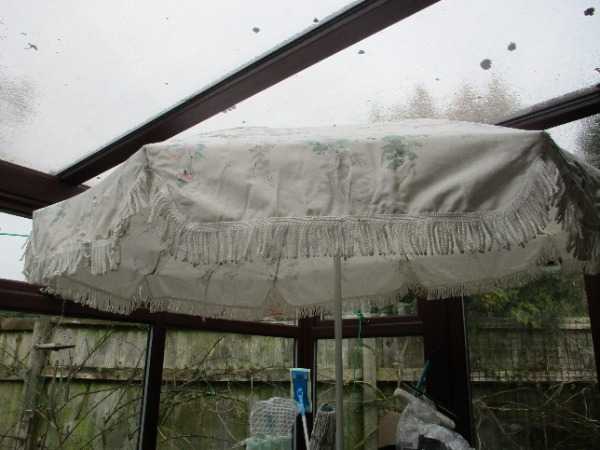 four chairs - some recovered by my mum. and garden table parasol, slightly stained