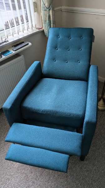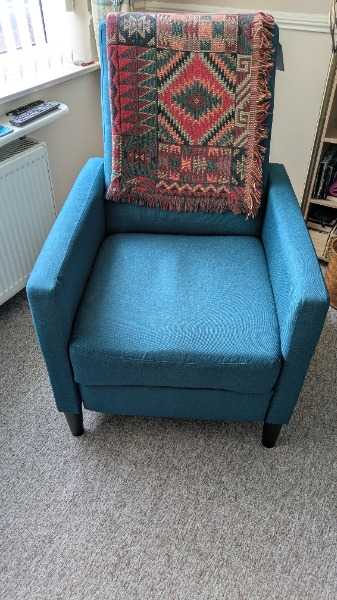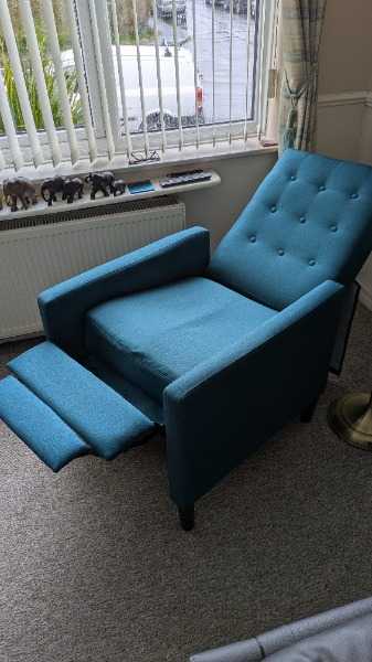Lovely teal recliner chair. Very comfortable and lovely to sleep on. Getting rid as we need space for a different chair for dad. Pick up only.