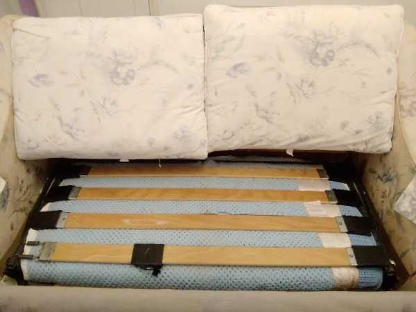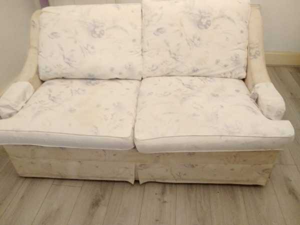 Used 2-seater sofa bed, well used but still solid and serviceable. Faded material but comfortable, as a sofa and a bed, cream/white blue floral.