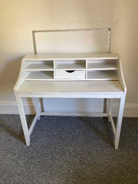 White desk with shelves and one drawer and pull out table. Signs of wear and tear