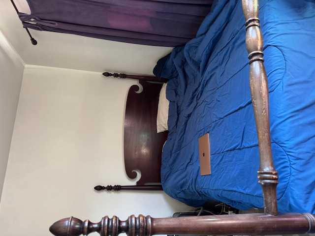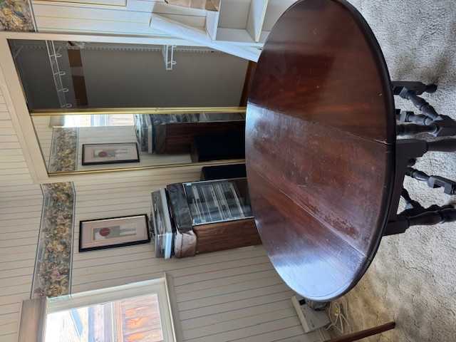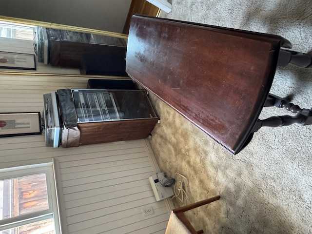 Mahogany 4 poster full sized bed, and gateleg table, Fisher stereo system, phonograph, in plexiglas cabinet.
