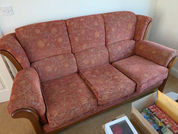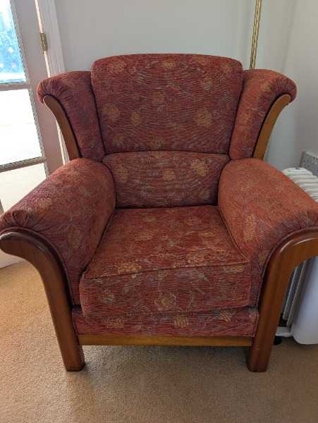 Lovely matching 3 x seater sofa and armchair. Red with floral debossing in fabric and wooden scroll arms. No staining or rips, has fire labels. Must be collected before house clearance on Weds