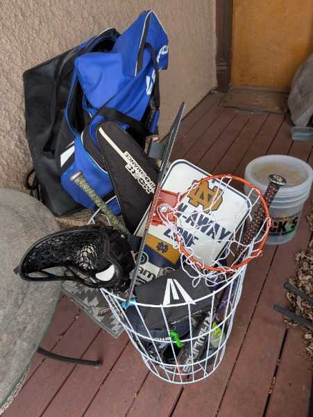 Lacrosse, Baseball, Football, Hockey, Tennis, Indoor Basketball, Carry Bags, Safety, Balls,  Storage Container.  A little bit of everything. Must take all. Easy porch pick up.