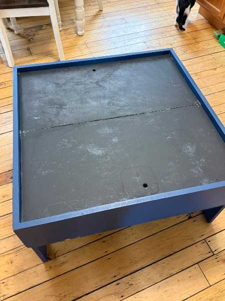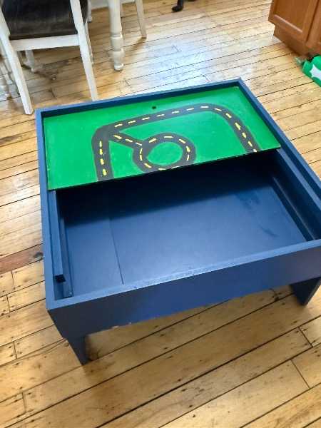 Small, handmade “train table.” Sturdy, Good condition. Versatile, has storage underneath the covers. One side of covers has a little street and the other sides are chalkboard! We’ve used this for trains, trucks, Legos, drawing, etc…